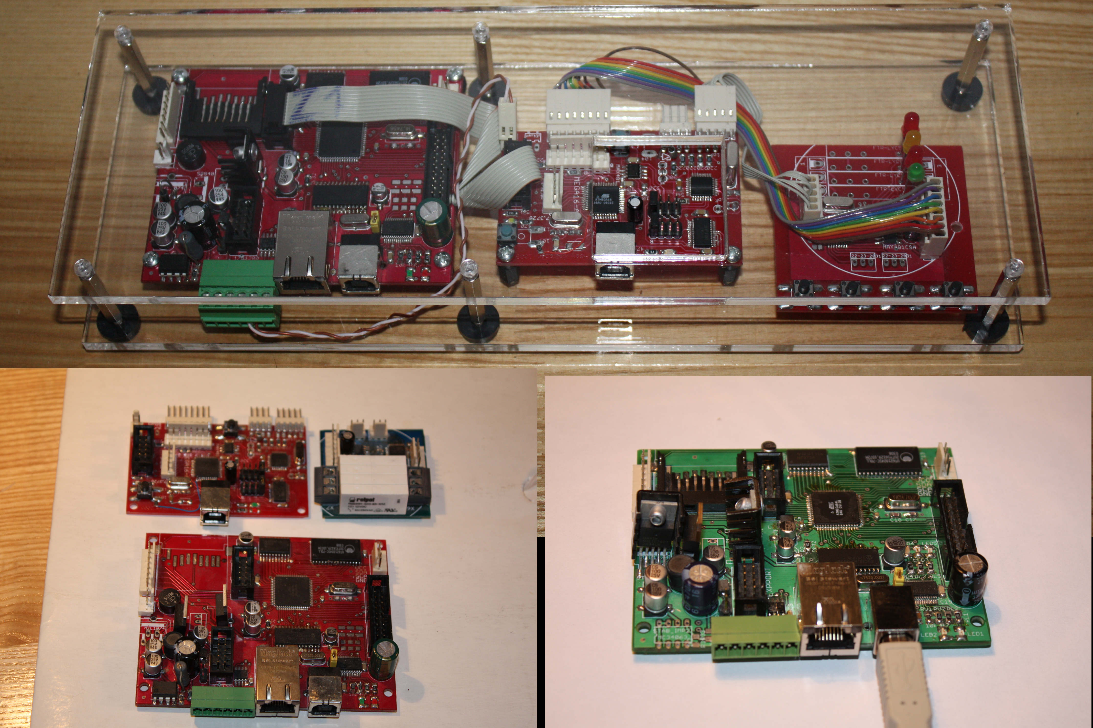 First wersion was using ETH-Rs232 converter. Next serial port was multiplexed into 16 serials. There was SPI bus that was interconnecting all the modules. AVR firmware for slave devicess (SPI Slave) was implemented in assembler.